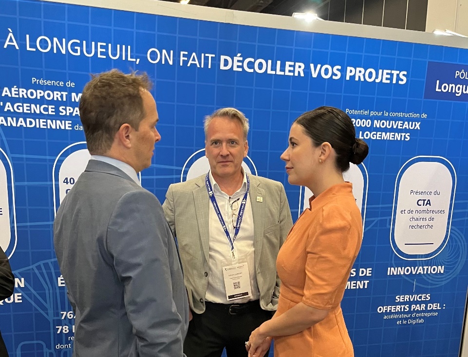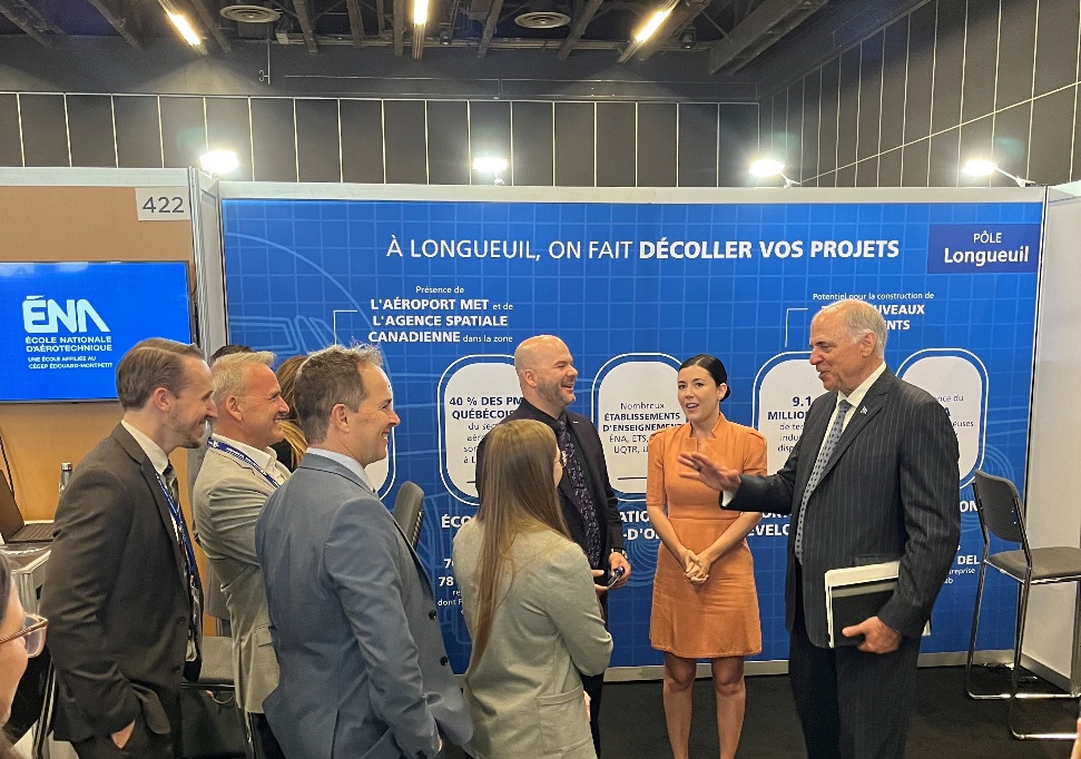 De g. à d. : Pascal Désilets, directeur de l’École nationale d’aérotechnique (ÉNA) et Sylvain Lambert, directeur général du cégep Édouard-Montpetit, échangent avec Catherine Fournier, mairesse de la Ville de Longueuil, devant le stand du pôle Longueuil, au Forum innovation aérospatiale international.