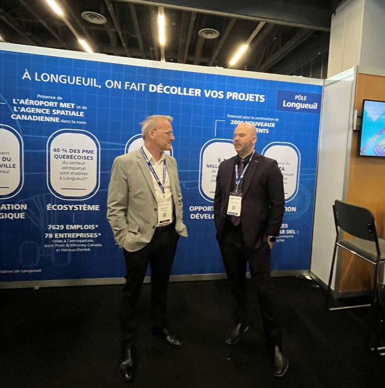 De g. à d. : Sylvain Lambert, directeur général du cégep Édouard-Montpetit et Alexandre Parizeau, directeur général de la Ville de Longueuil au stand du pôle Longueuil, au Forum innovation aérospatiale international.